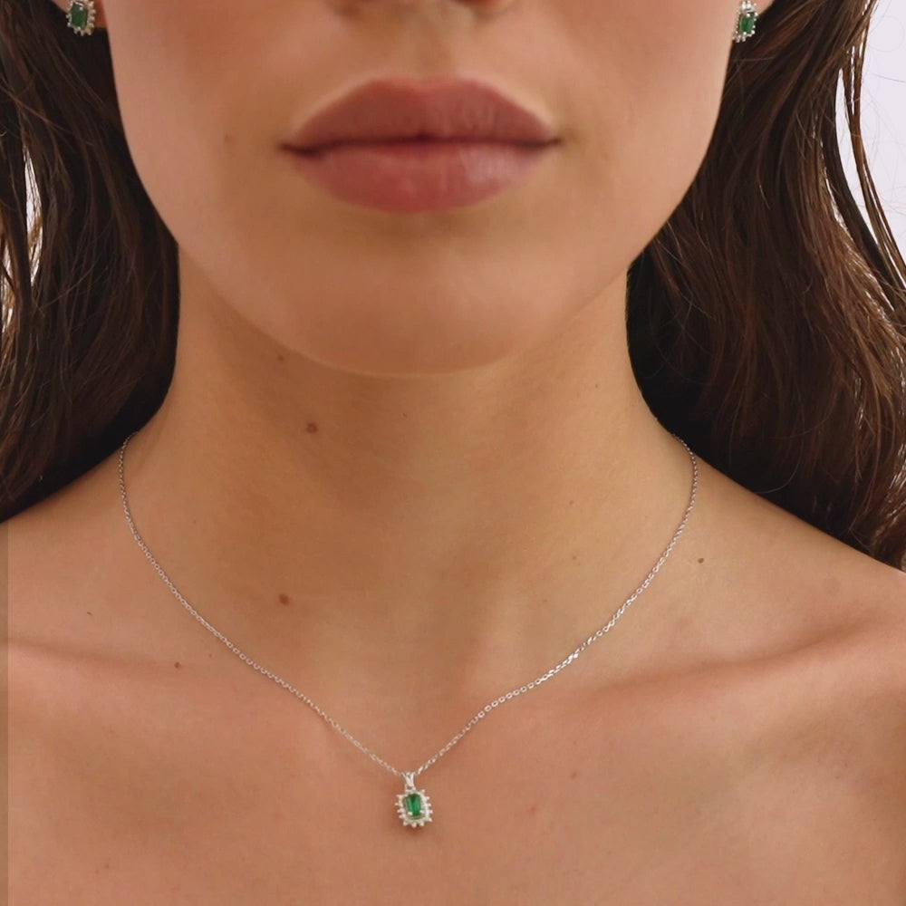The 14K white gold Pendant Chain with 0.11 ct diamonds and 0.32 ct emerald offers timeless beauty. The delicate combination of the diamonds' sparkle and the emerald's green transforms this pendant into a piece full of charm and elegance. Karat: 14K, Diamonds: 0.11 ct, Emerald: 0.32 ct, Color: FS1