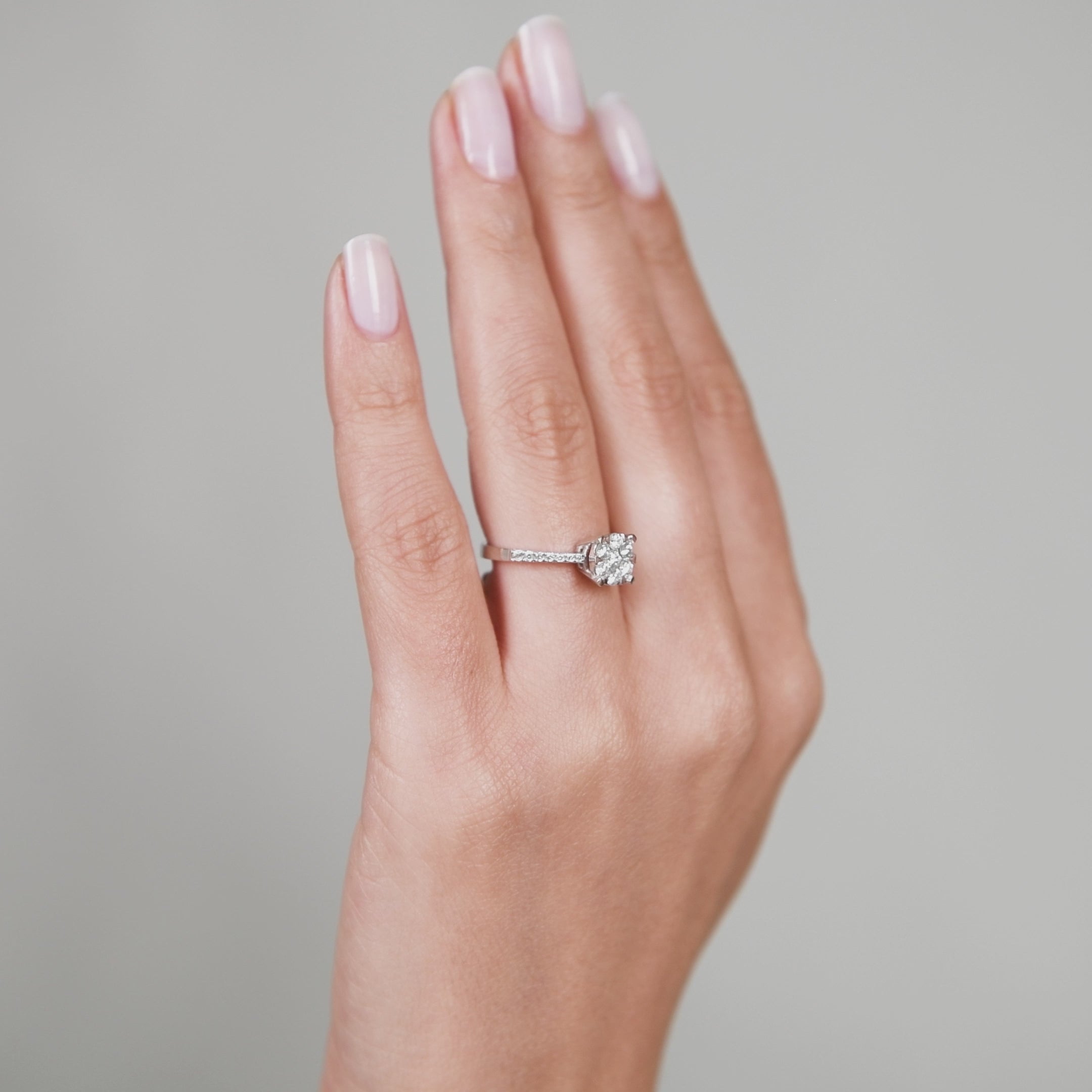 The 14K white gold Engagement Ring with 0.55 ct diamonds is a piece of jewelry that captivates with its elegant and timeless brilliance. Featuring 0.55 ct diamonds of FS1 and FVS1 clarity, and F color, this ring exudes refinement and understated luxury. The 14K white gold provides a perfect backdrop to highlight the flawless sparkle of the diamonds, creating a subtle and sophisticated contrast. Karat: 14K, Diamonds: 0.55 ct, Color: F, Clarity: FS1 + FVS1