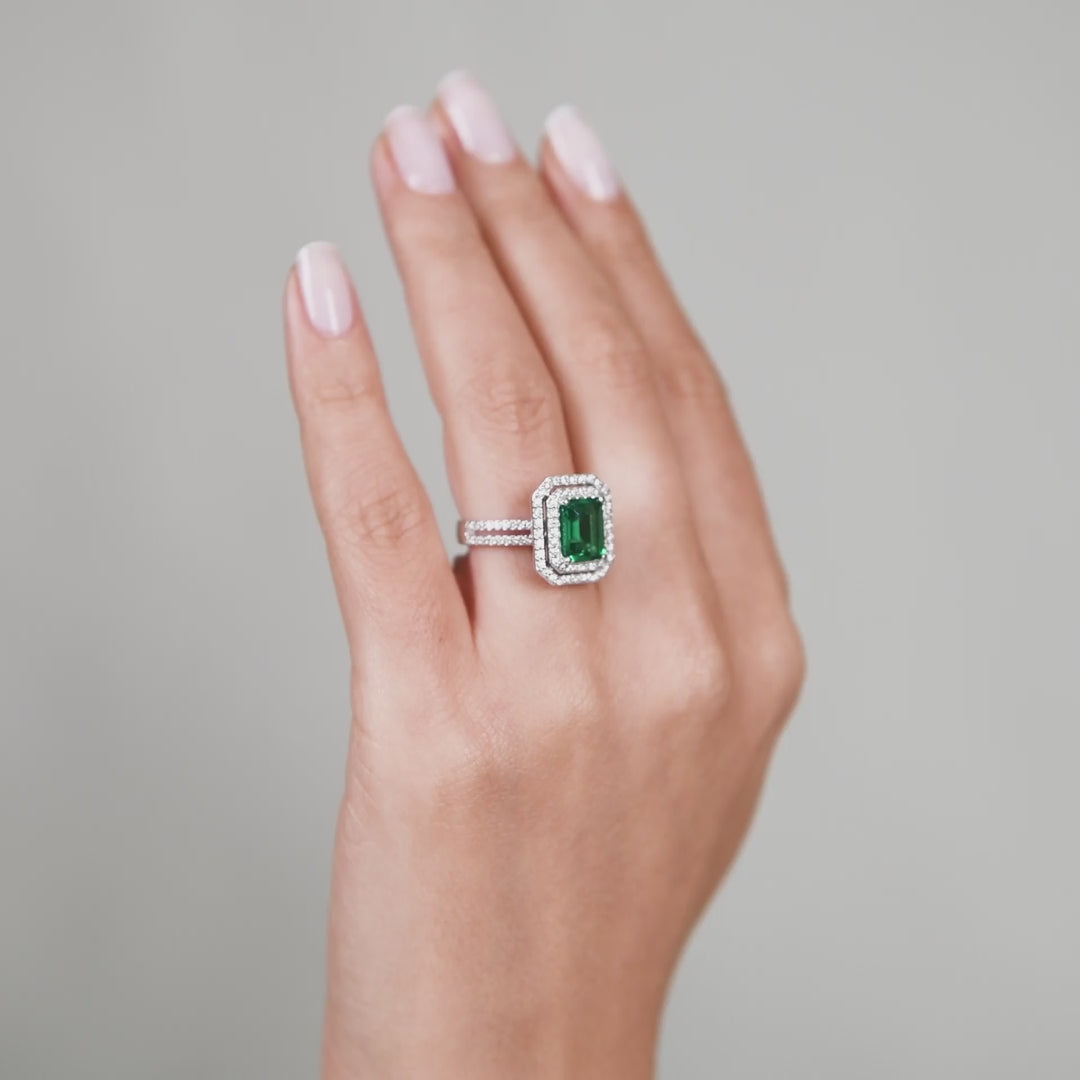 The 14K White Gold Ring with 0.78ct Diamonds and 2.09ct Topaz is designed to highlight the beauty of the central emerald, while the diamond halo adds an extra touch of elegance and sparkle. This ring is perfect for engagements, anniversary gifts, or as a statement piece for special occasions. It symbolizes love and loyalty, blending tradition with modern elegance. Karat: 14k, Diamonds: 0.78ct, Color: F, Clarity: VS1, Precious stone: Emerald, Cut: EM, Stone carat: 2.09ct